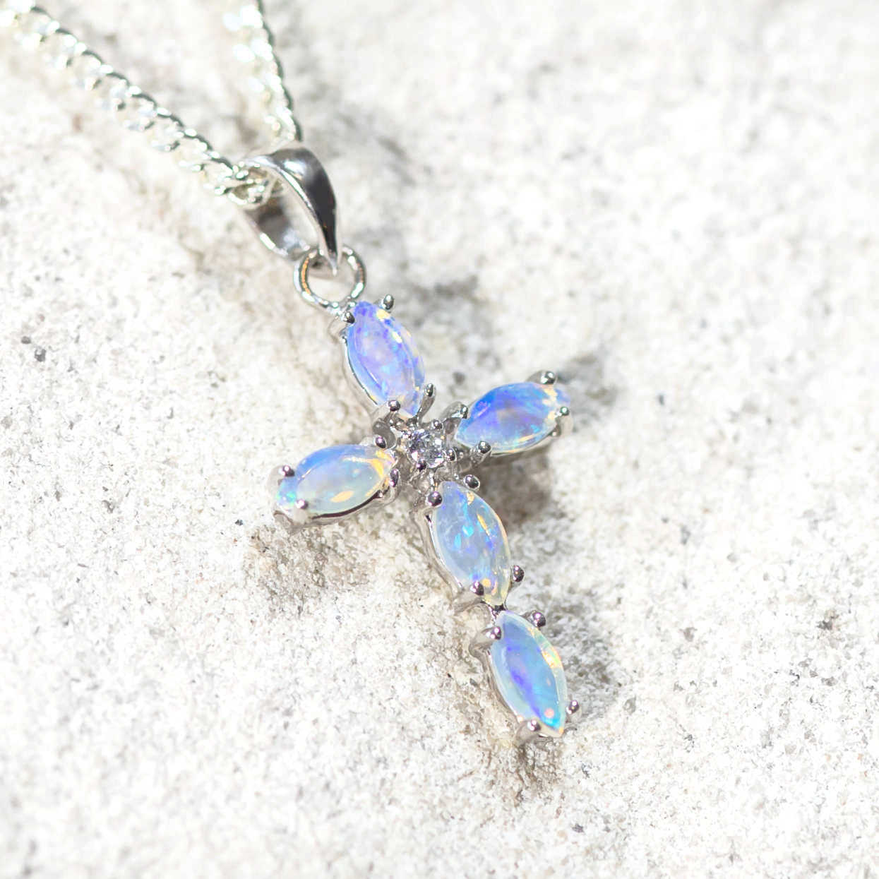 'Cross Mini Blue' Crystal Opal Pendant Silver